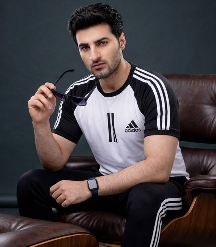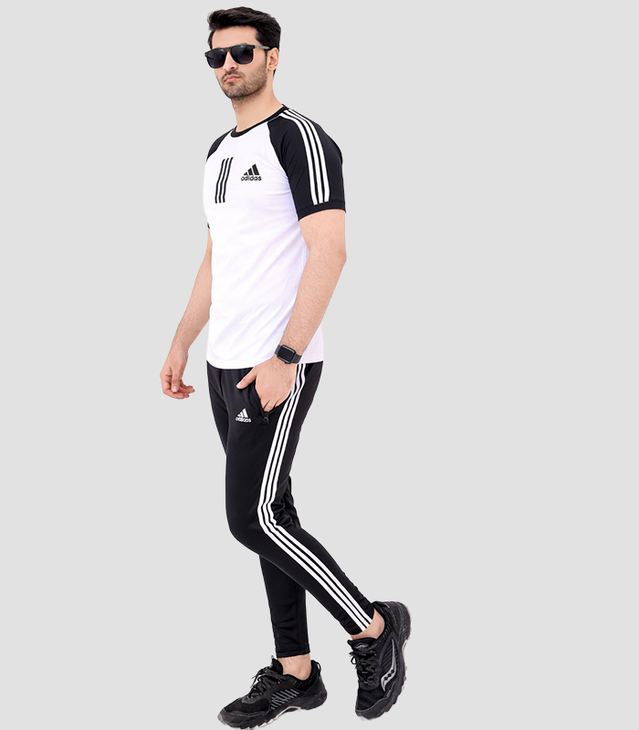 The set includes a breathable short-sleeve t-shirt with contrast sleeves and matching slim-fit trousers featuring the iconic side stripes. Its lightweight and stretchable material allows easy movement, making it ideal for gym sessions, running, or everyday use.